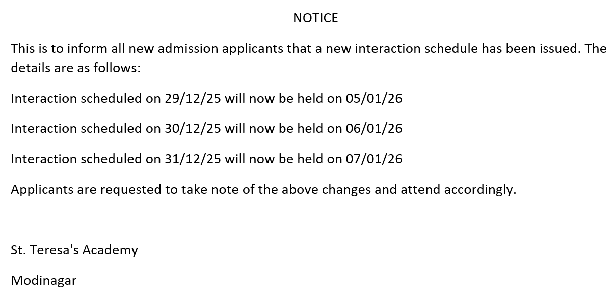 St. Teresa's Academy was established in 1982 by the Catholic Diocese of Meerut. The Institution is owned by the Catholic Diocese of Meerut, a body registered under the Societies Registration Act, 1960. The medium of instruction is English and the pupils are prepared for Indian School Certificate Examination taken at the end of Class XII. Therefore, with regard to the syllabus, the school is guided by the policies and programmes of the Council for the Indian School Certificate Examination, New Delhi. St. Teresa's Academy is a minority Educational Institution recognised by the National Commission for Minority Educational Institution Act 2004, covered under Article 30 of the Constitution of India.