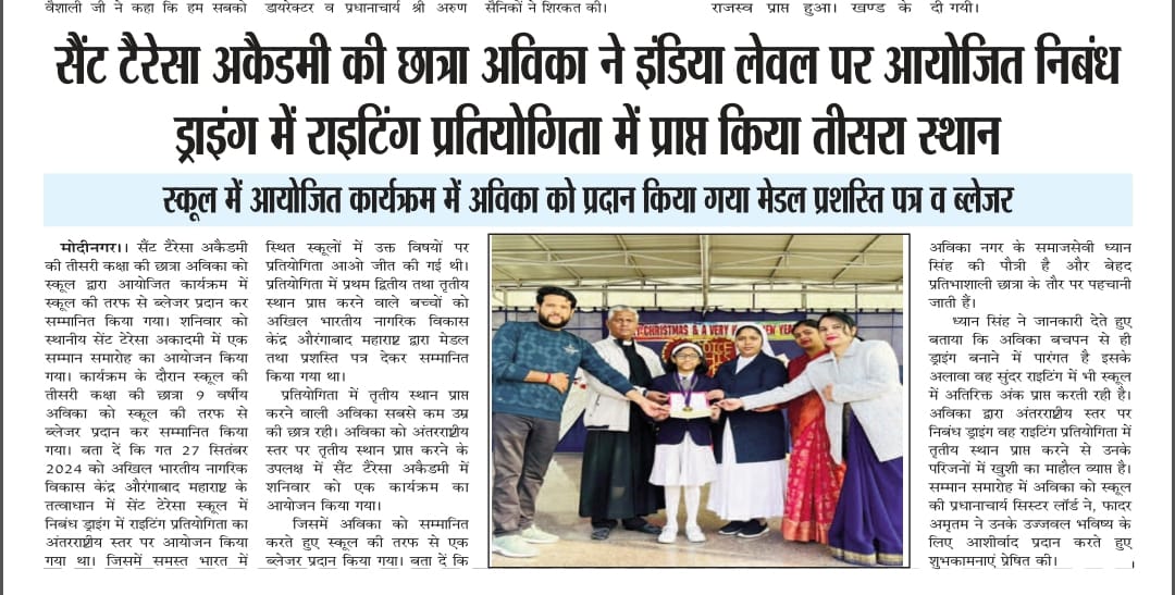 The Award Ceremony and Toppers 2024–25 was a grand celebration of excellence, dedication, and achievement at St. Teresa’s Academy. The event honored the outstanding academic performers and achievers who brought pride to the institution through their hard work and determination. Students were felicitated for their excellence in academics, co-curricular activities, and overall performance. The ceremony aimed to inspire others to strive for success with discipline and sincerity. The management, principal, and teachers congratulated the toppers for their remarkable accomplishments and encouraged all students to continue pursuing their goals with passion and perseverance. The joyous atmosphere reflected the school’s commitment to nurturing talent and promoting a culture of excellence, integrity, and continuous learning among its young achievers.