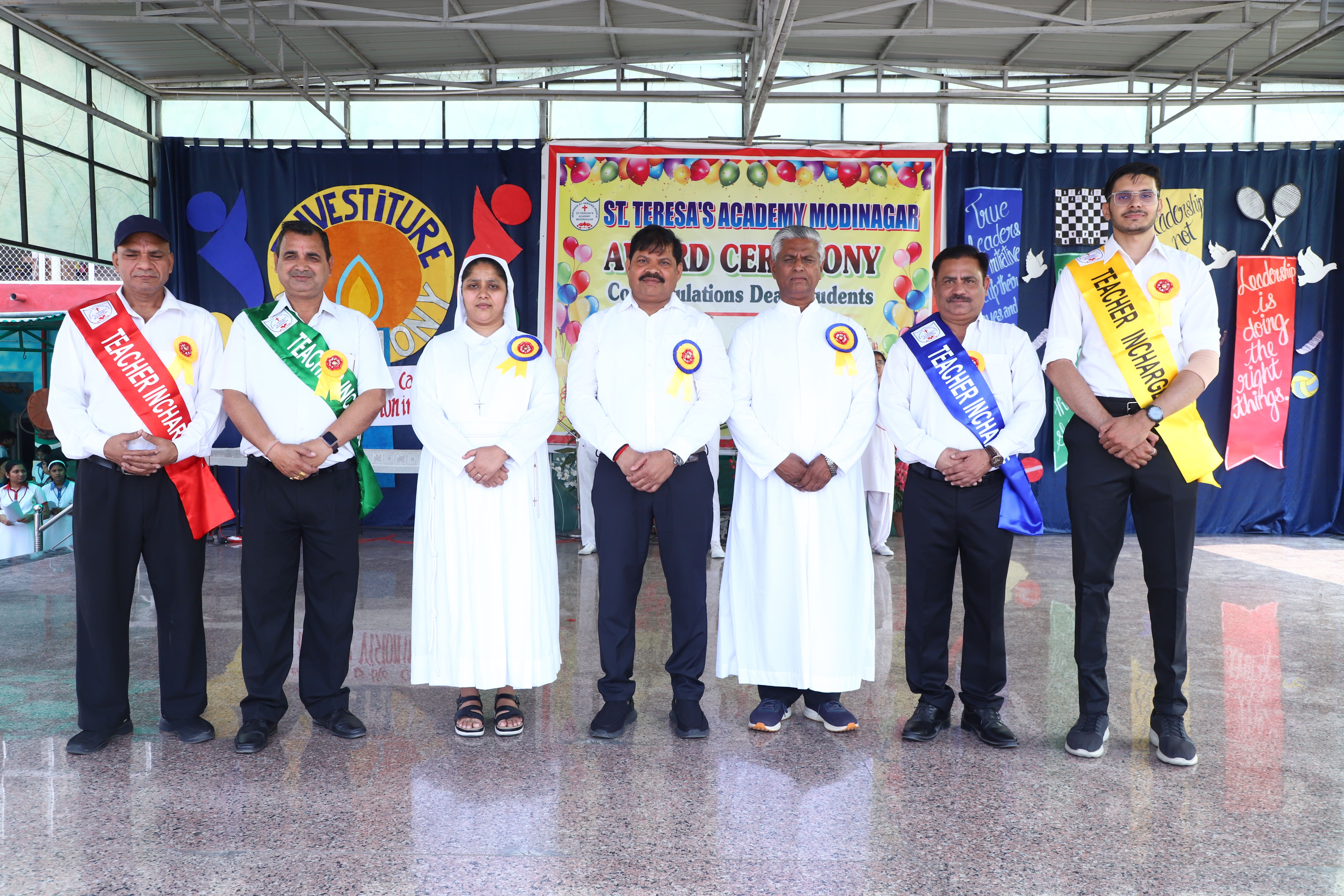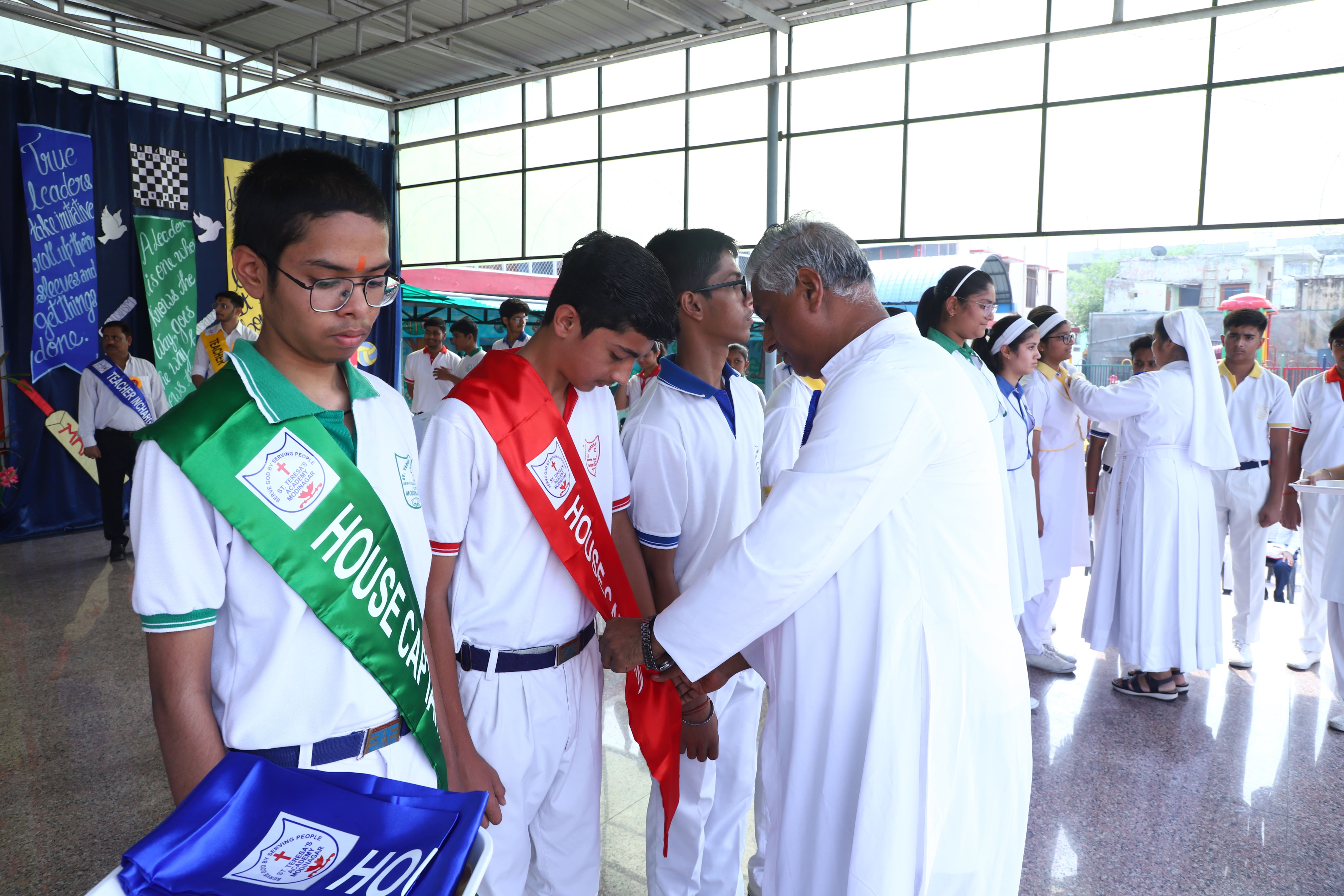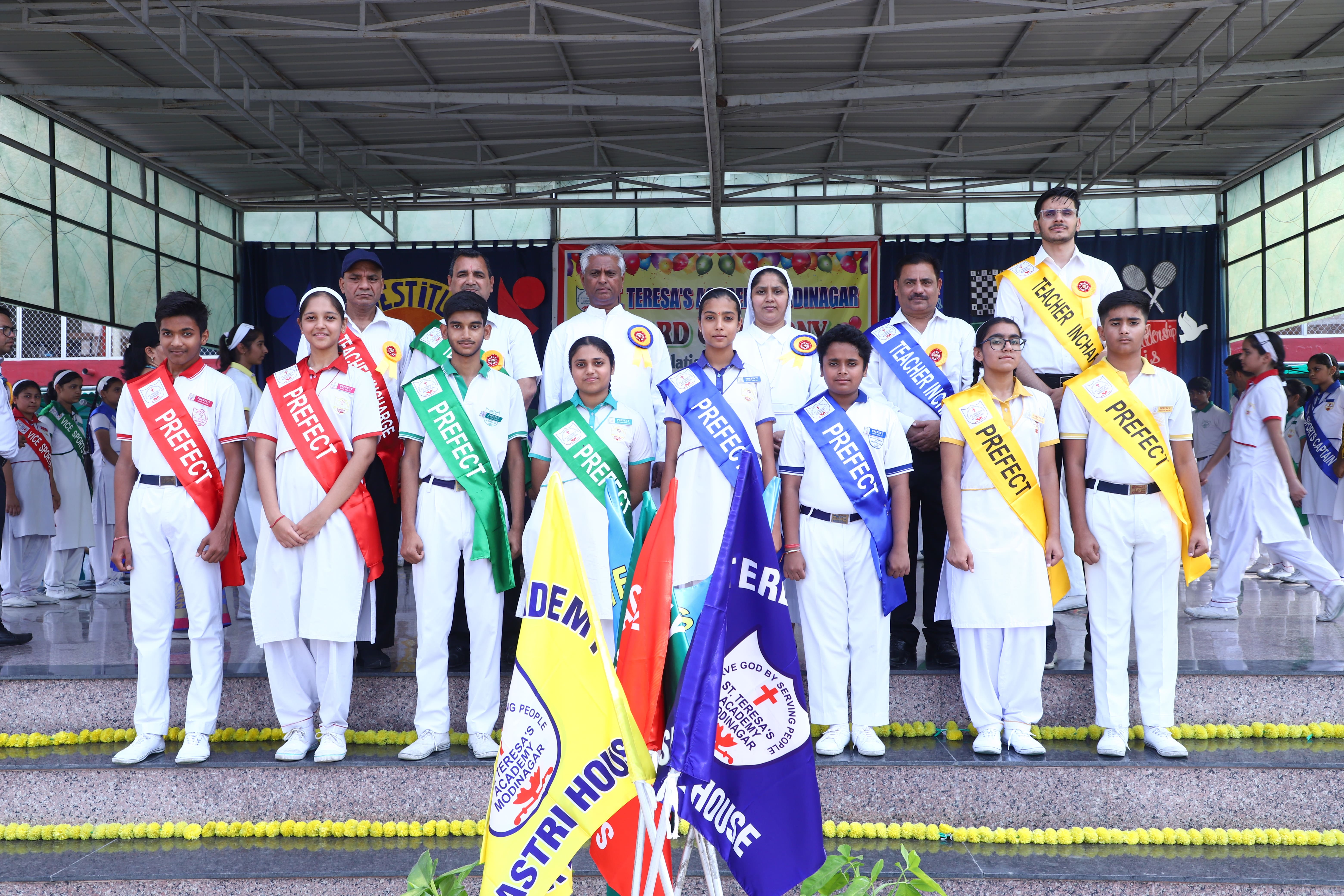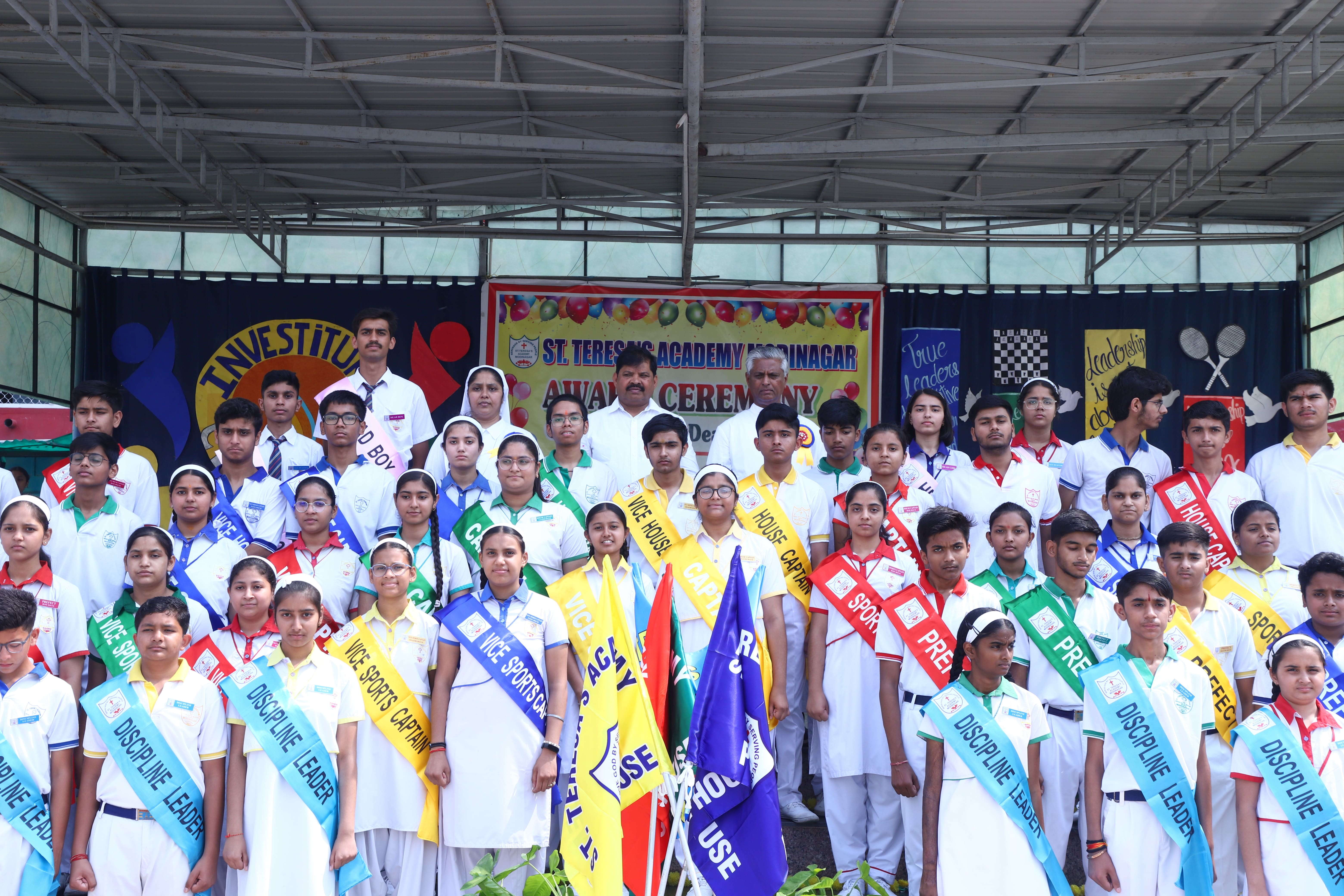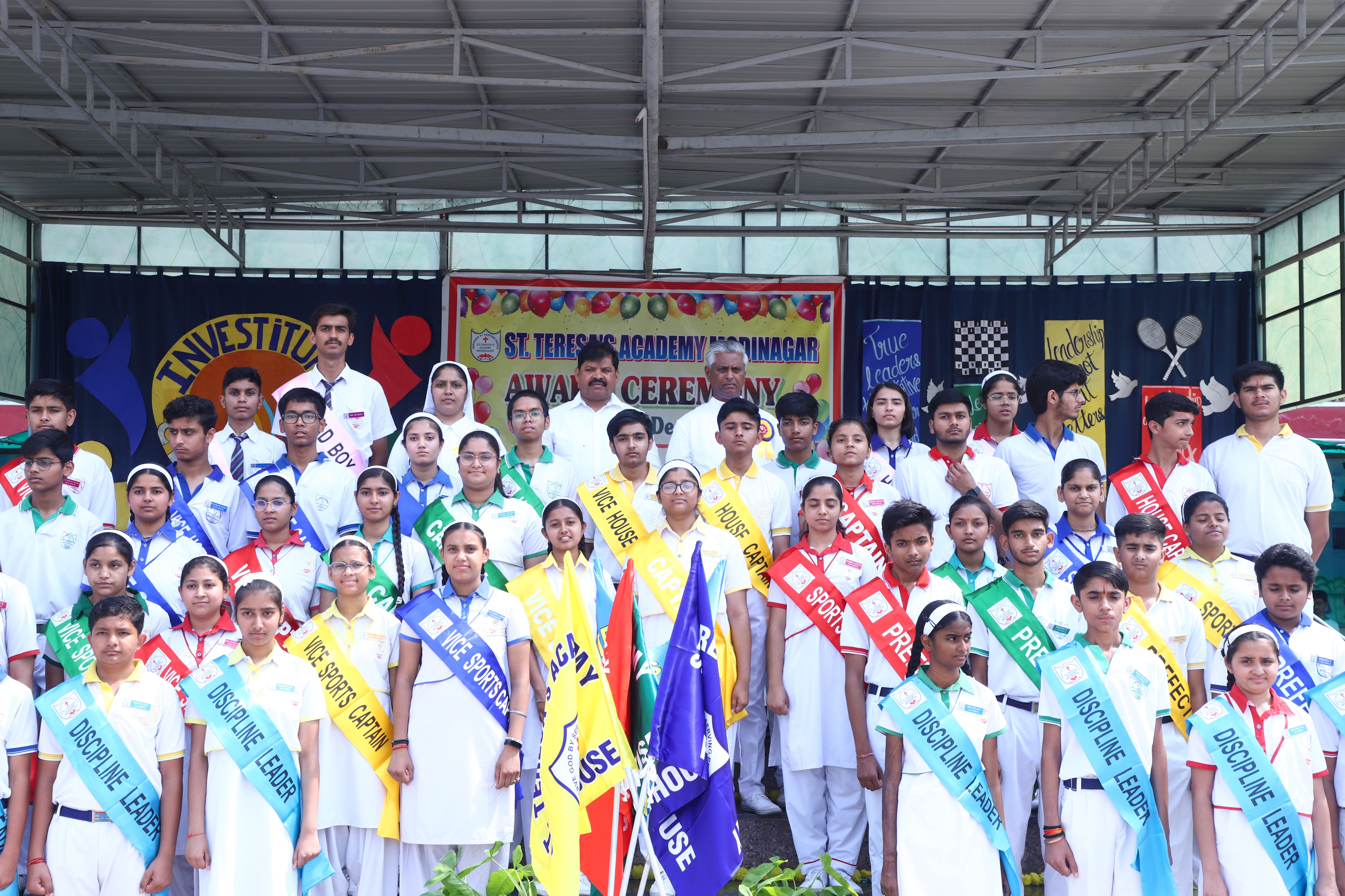 The Investiture Ceremony at St. Teresa's Academy, Modinagar is a prestigious event that marks the official induction of student leaders into their roles of responsibility and service. During the event, newly appointed leaders, including the Head Boy - Abhishek Sirohi, Head Girl - Divyanshi, Asst. Head Boy - Shaurya Dixit, Asst. Head Girl - Bhavya Nagpal, House Captains, and Prefects, receive their badges and sashes, signifying their readiness to lead with integrity and inspire their peers.