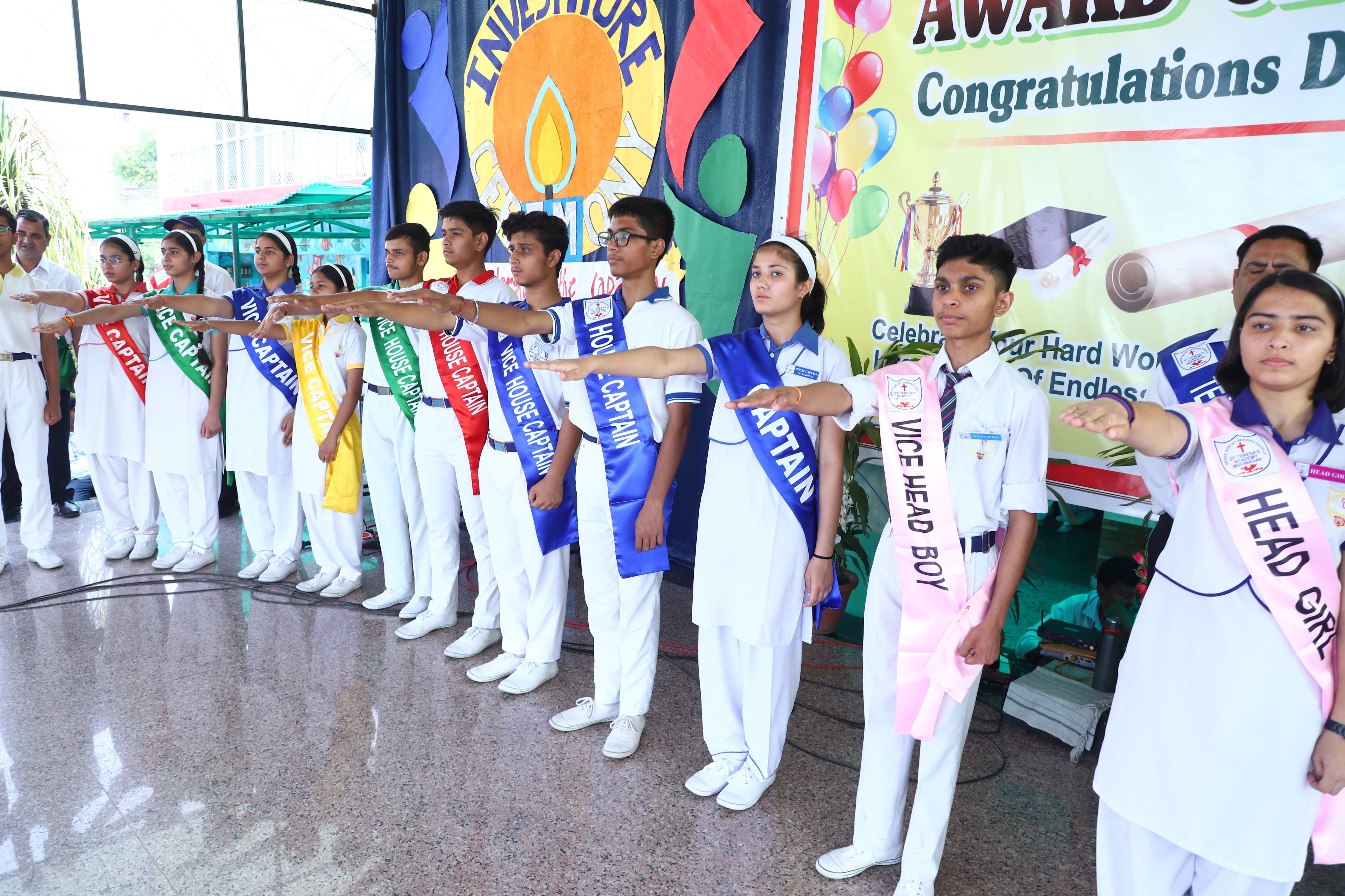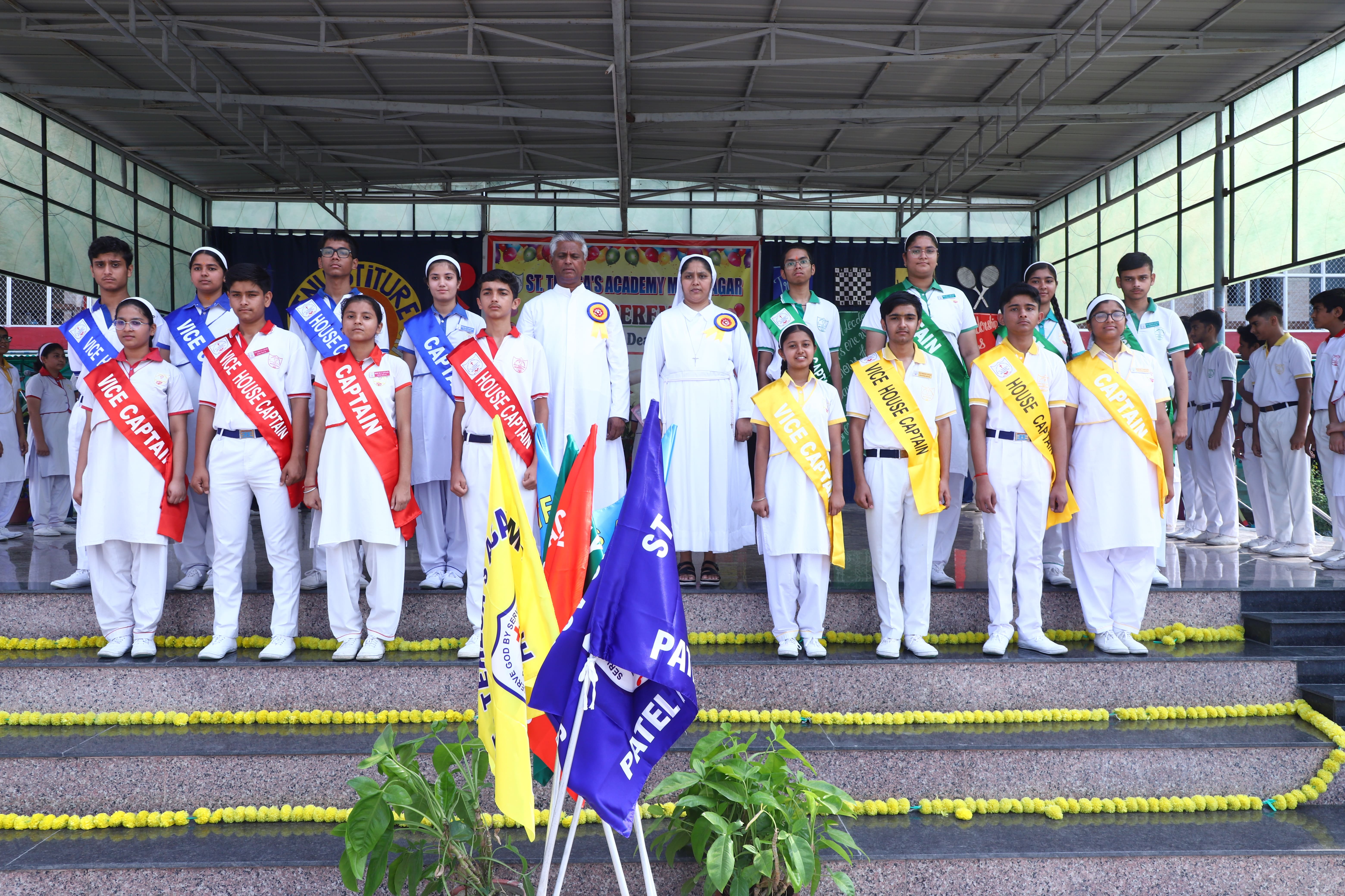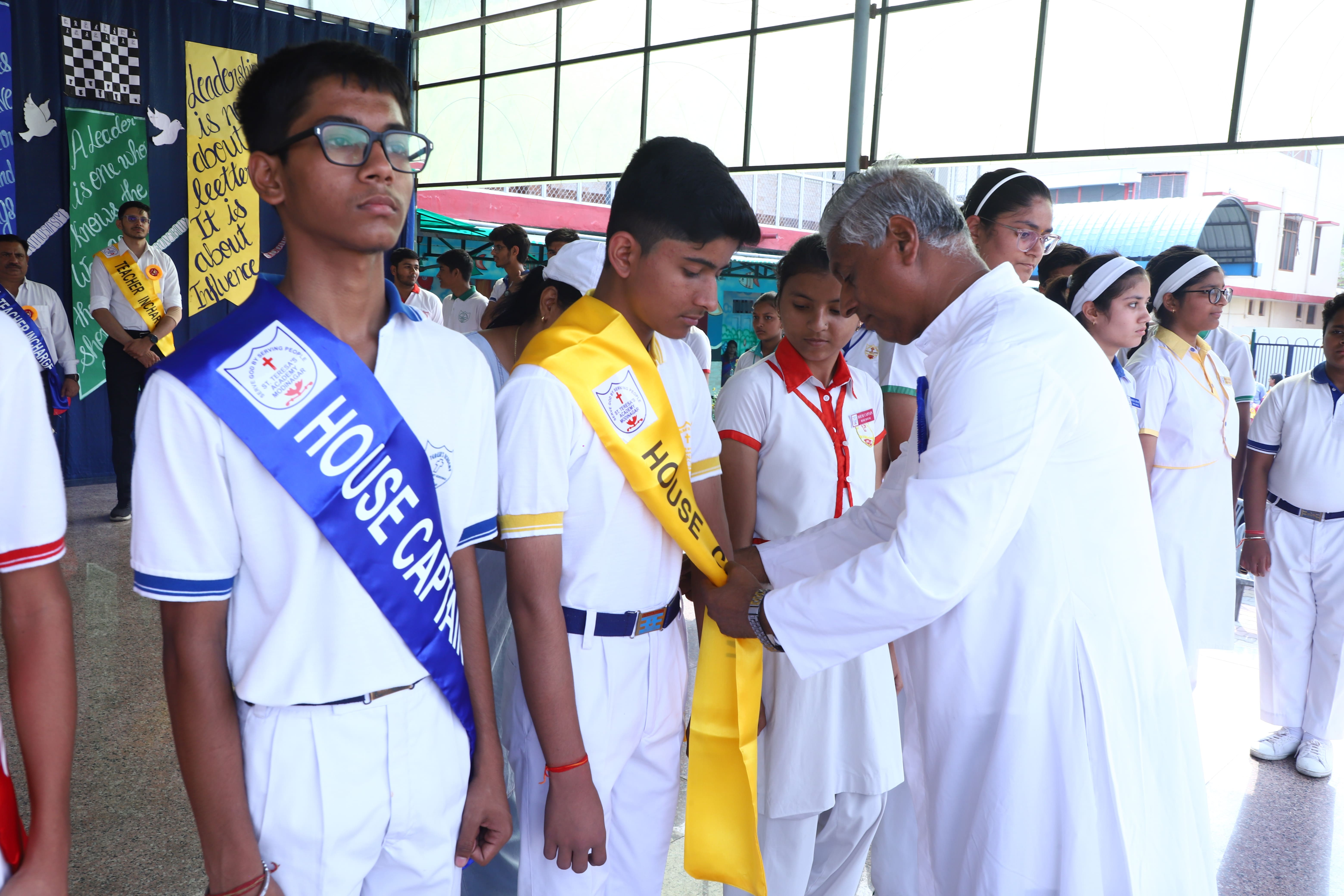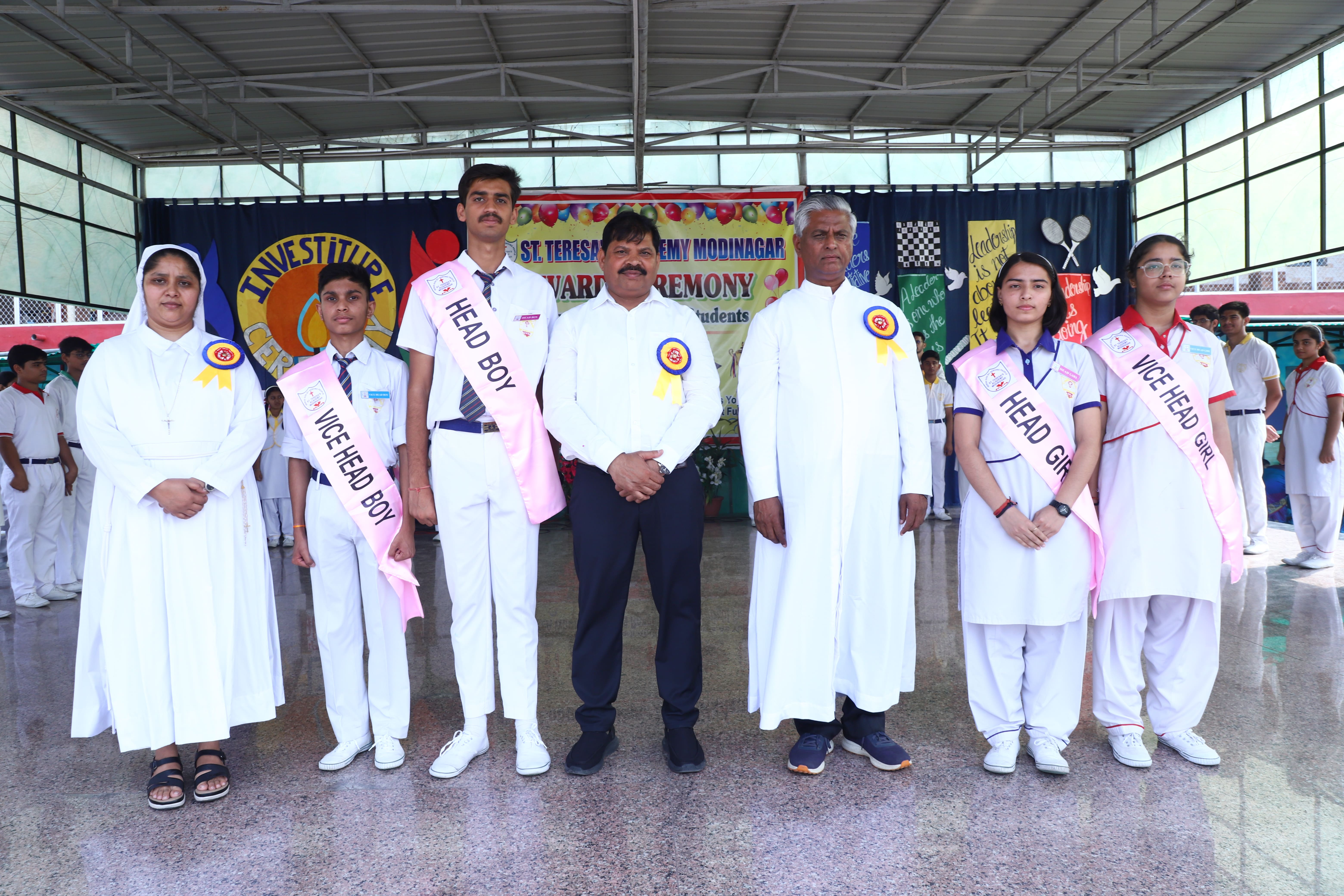 The Investiture Ceremony at St. Teresa's Academy, Modinagar is a prestigious event that marks the official induction of student leaders into their roles of responsibility and service. During the event, newly appointed leaders, including the Head Boy - Abhishek Sirohi, Head Girl - Divyanshi, Asst. Head Boy - Shaurya Dixit, Asst. Head Girl - Bhavya Nagpal, House Captains, and Prefects, receive their badges and sashes, signifying their readiness to lead with integrity and inspire their peers.