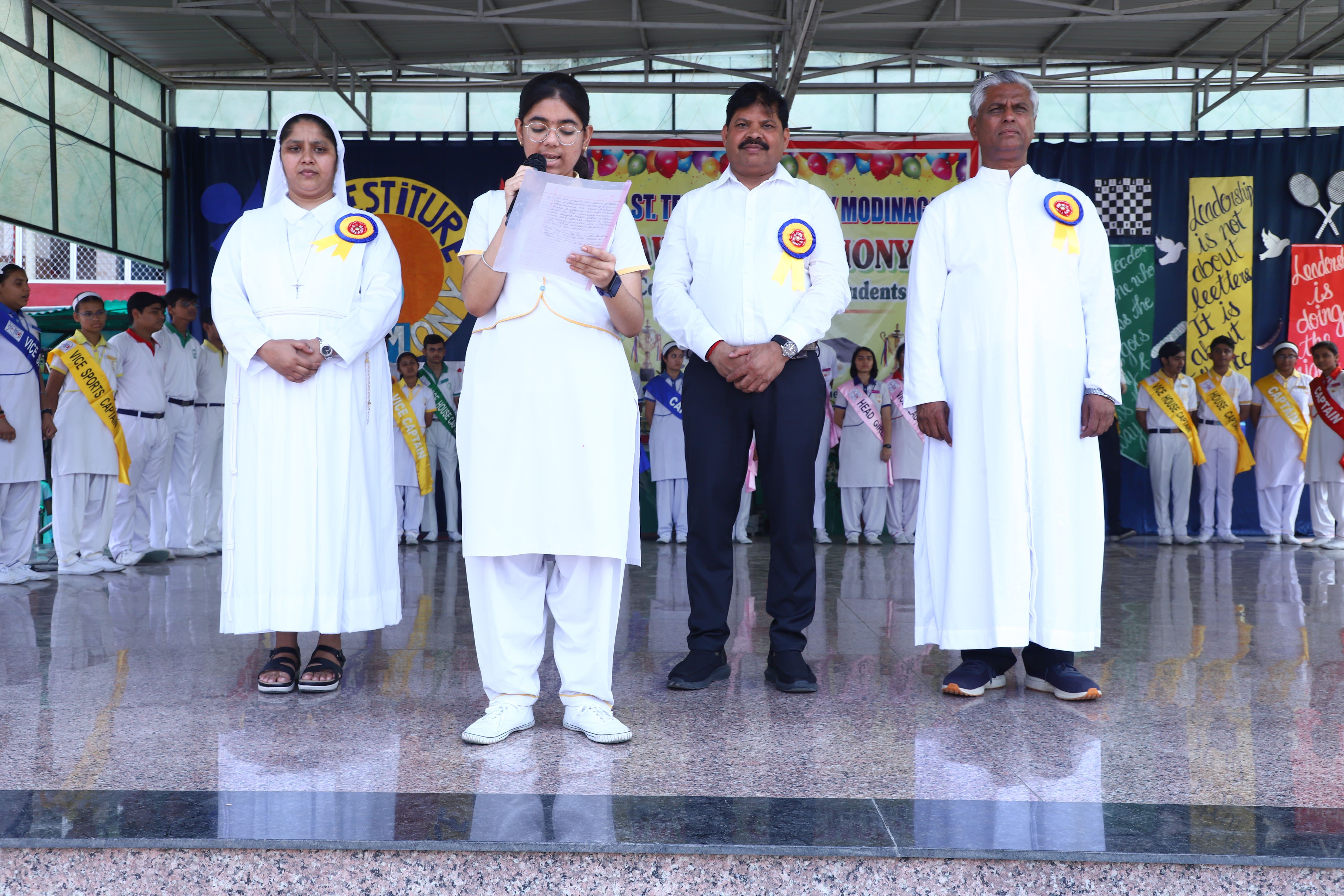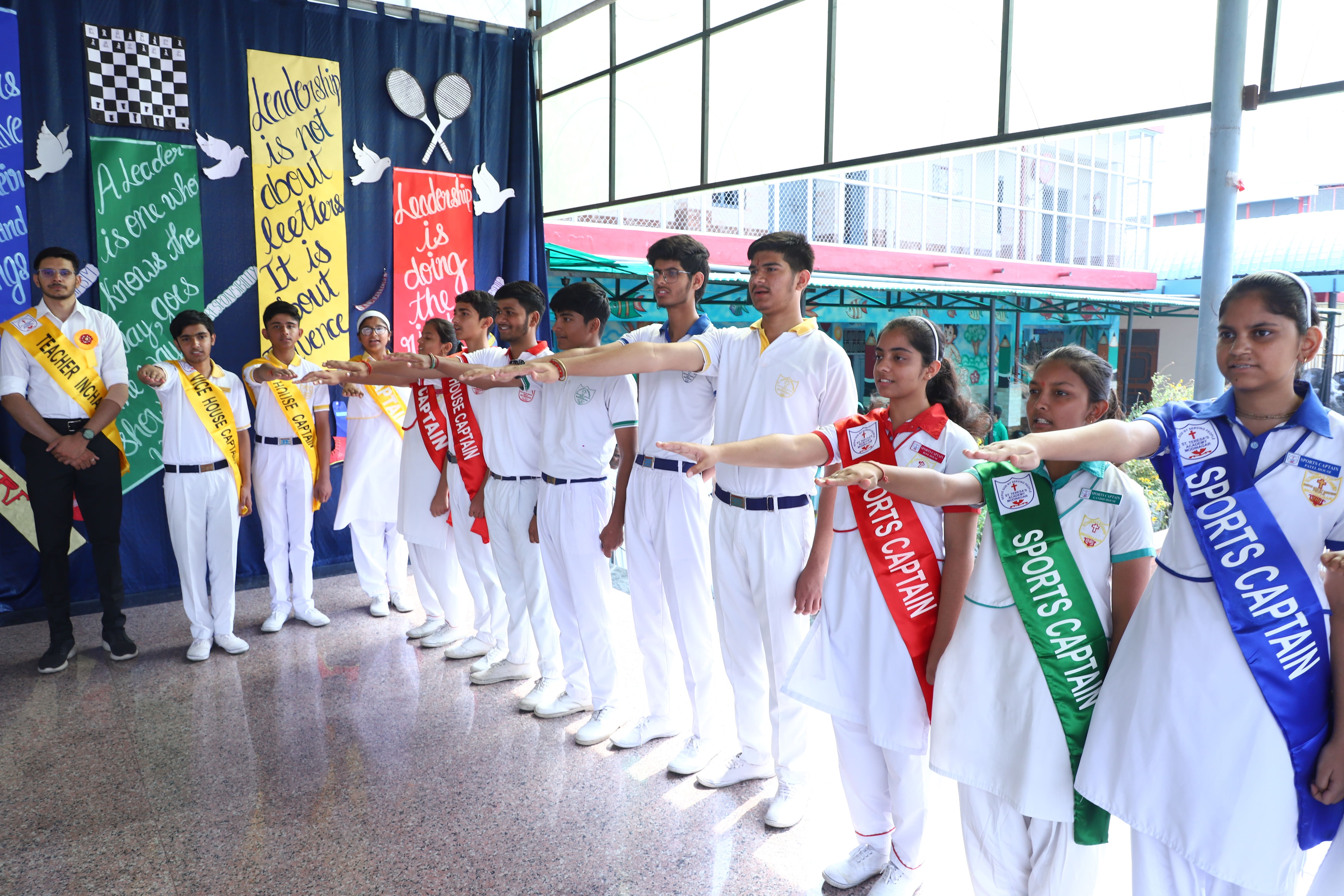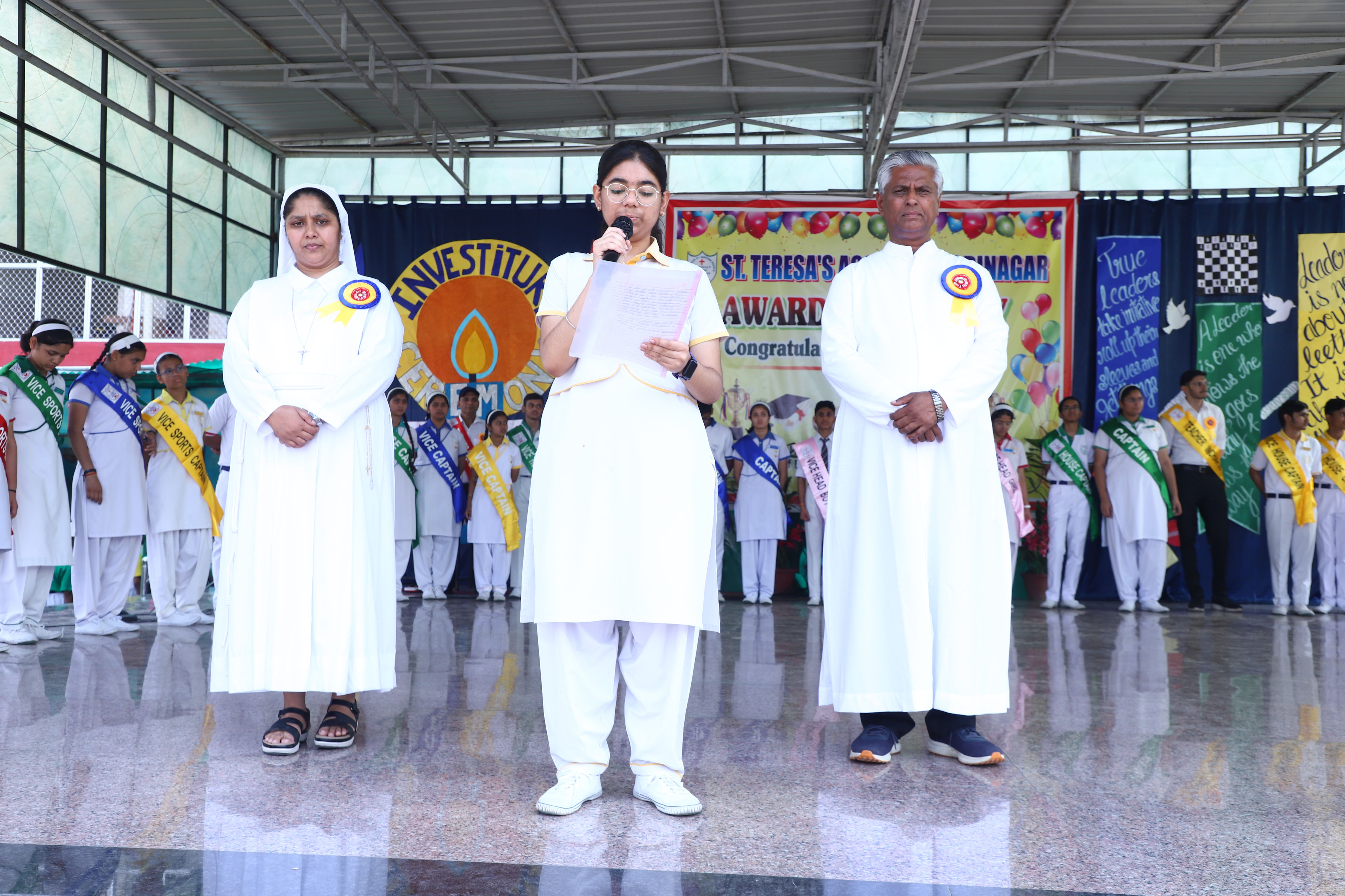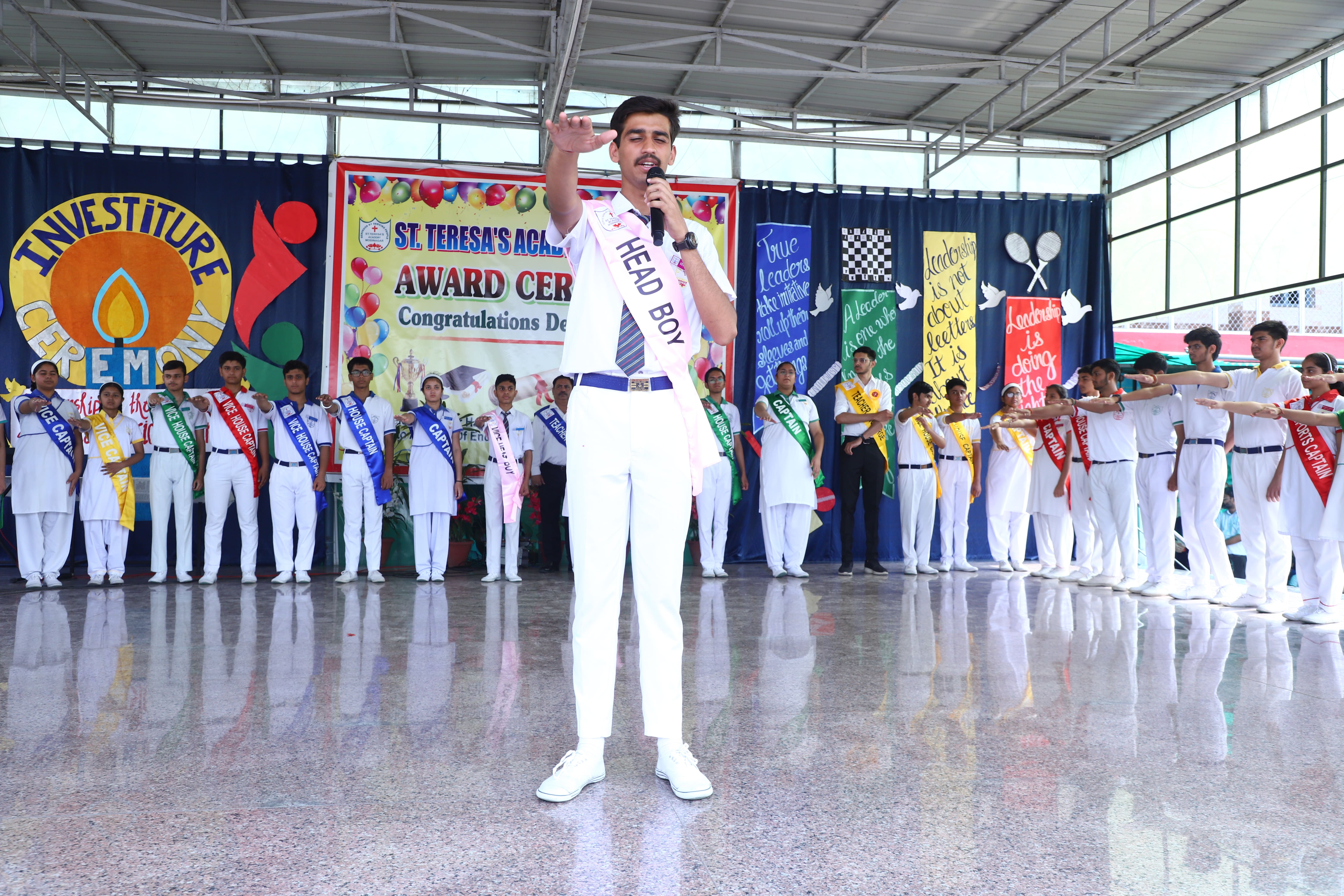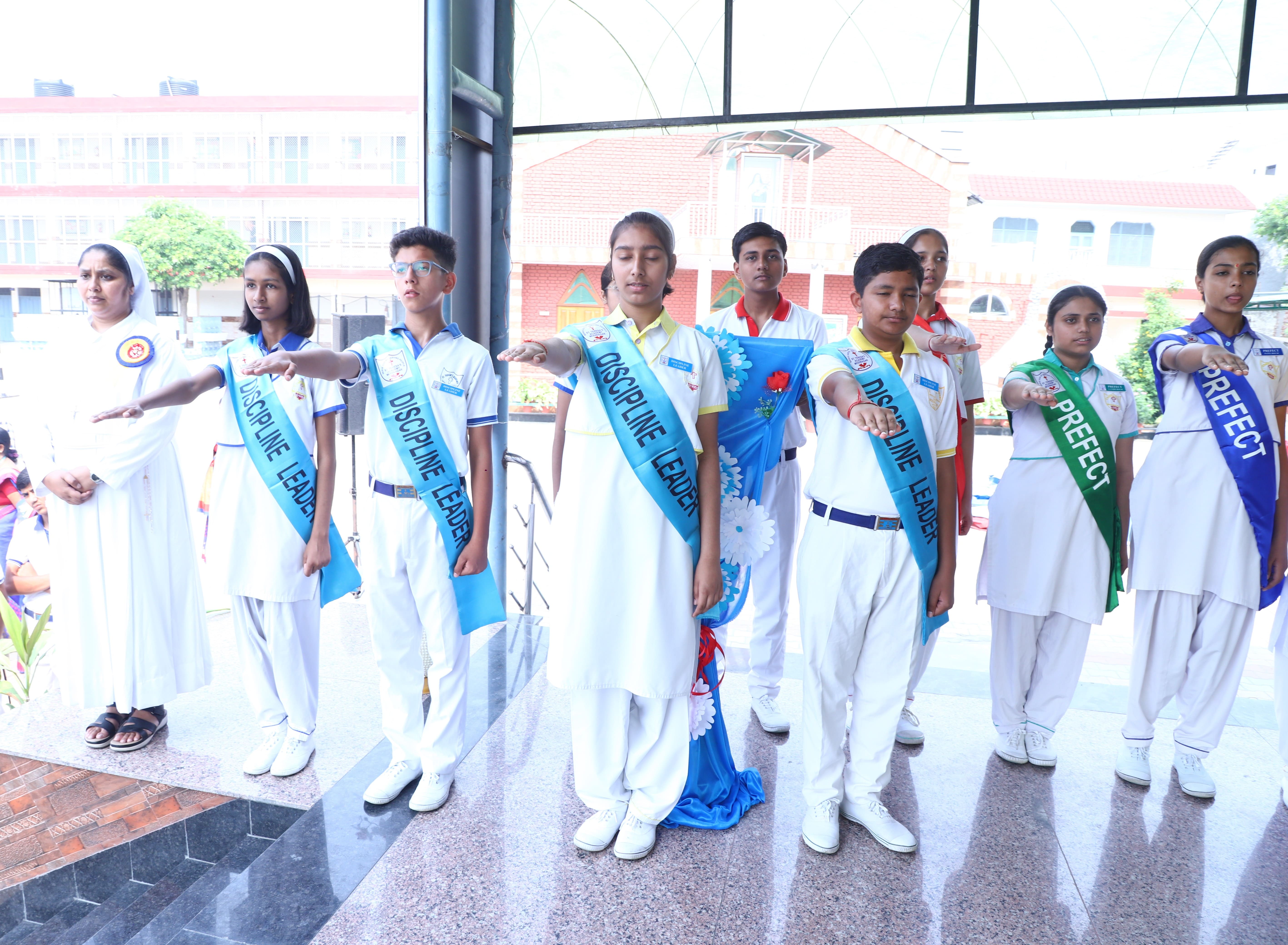 The Investiture Ceremony at St. Teresa's Academy, Modinagar is a prestigious event that marks the official induction of student leaders into their roles of responsibility and service. During the event, newly appointed leaders, including the Head Boy - Abhishek Sirohi, Head Girl - Divyanshi, Asst. Head Boy - Shaurya Dixit, Asst. Head Girl - Bhavya Nagpal, House Captains, and Prefects, receive their badges and sashes, signifying their readiness to lead with integrity and inspire their peers.