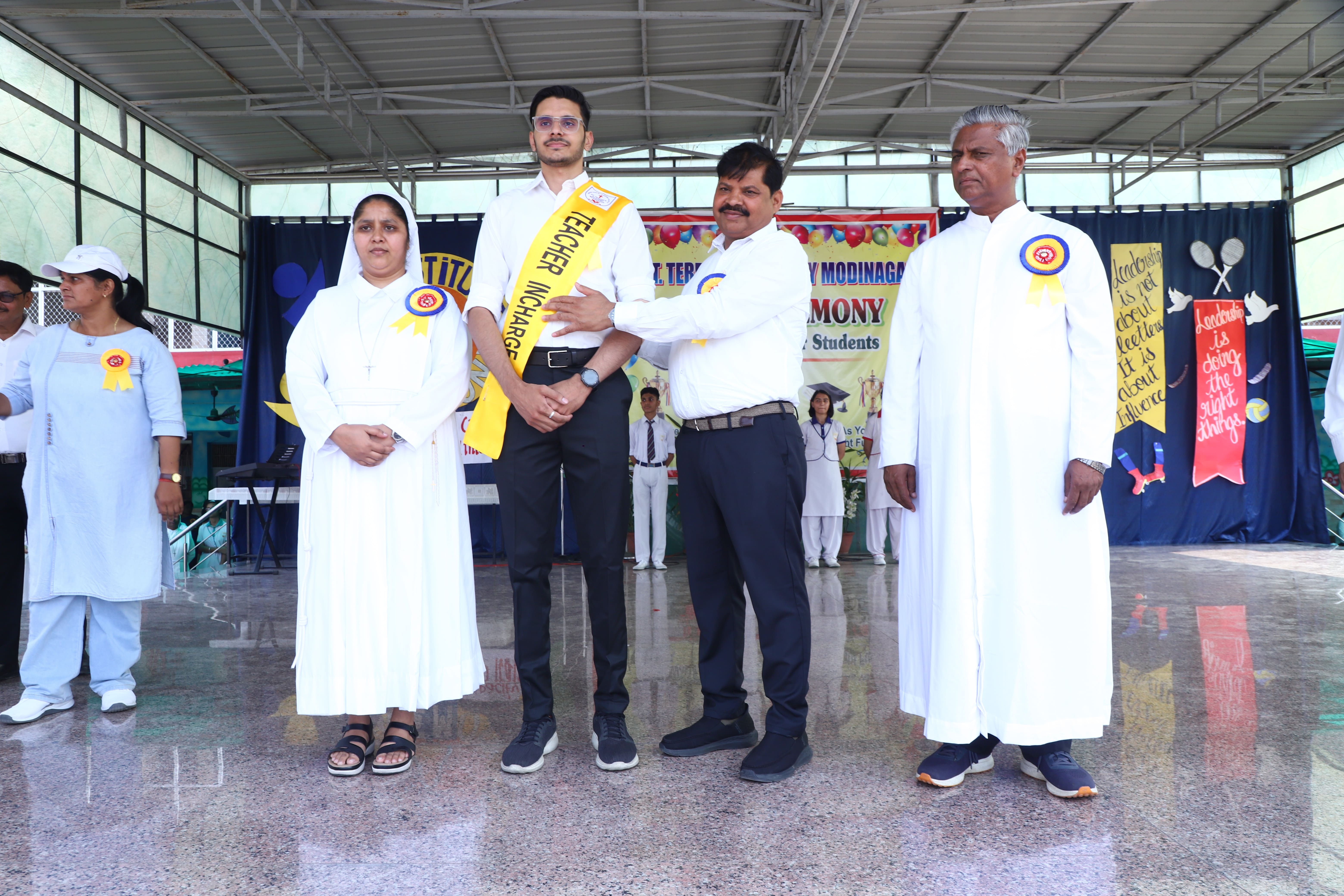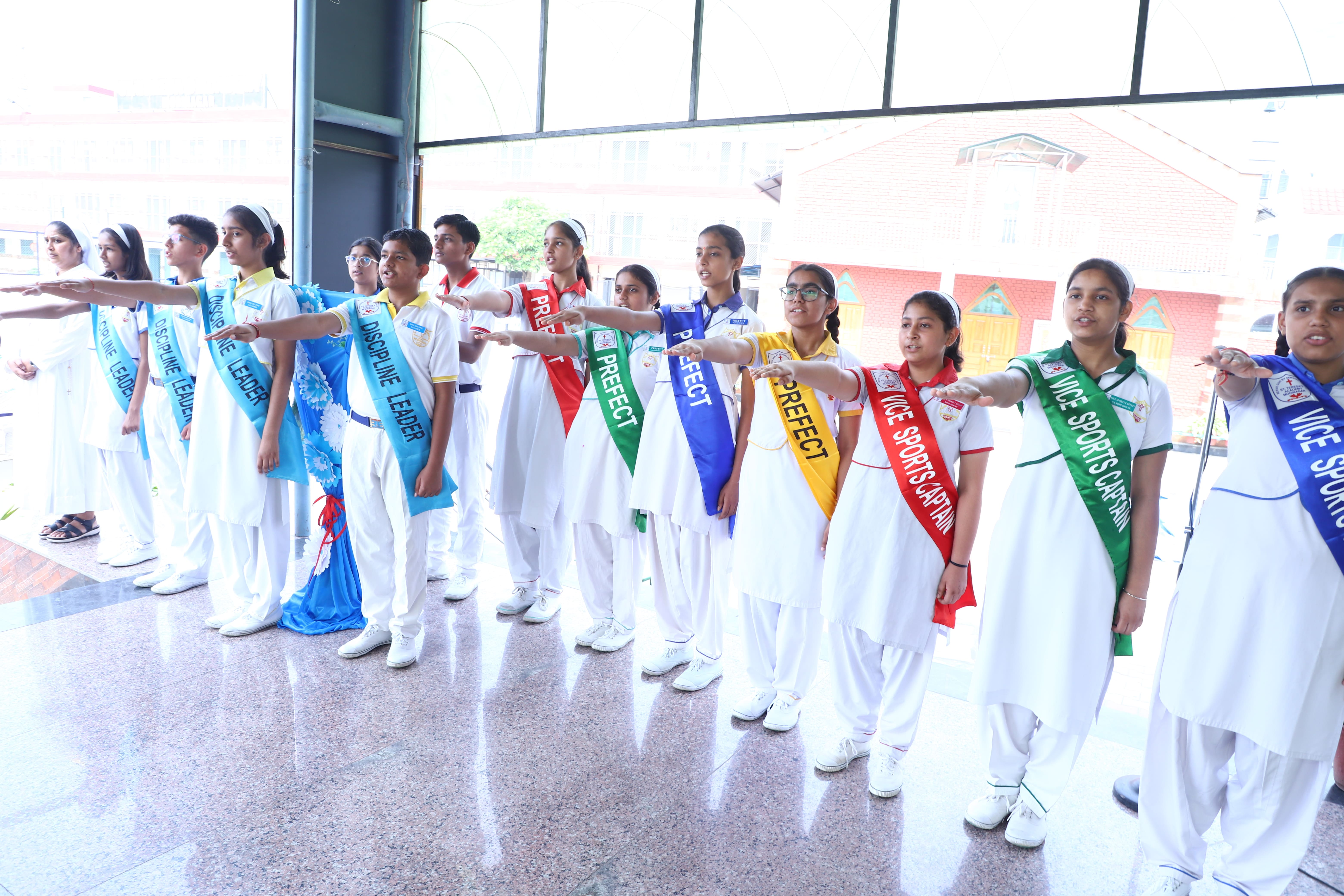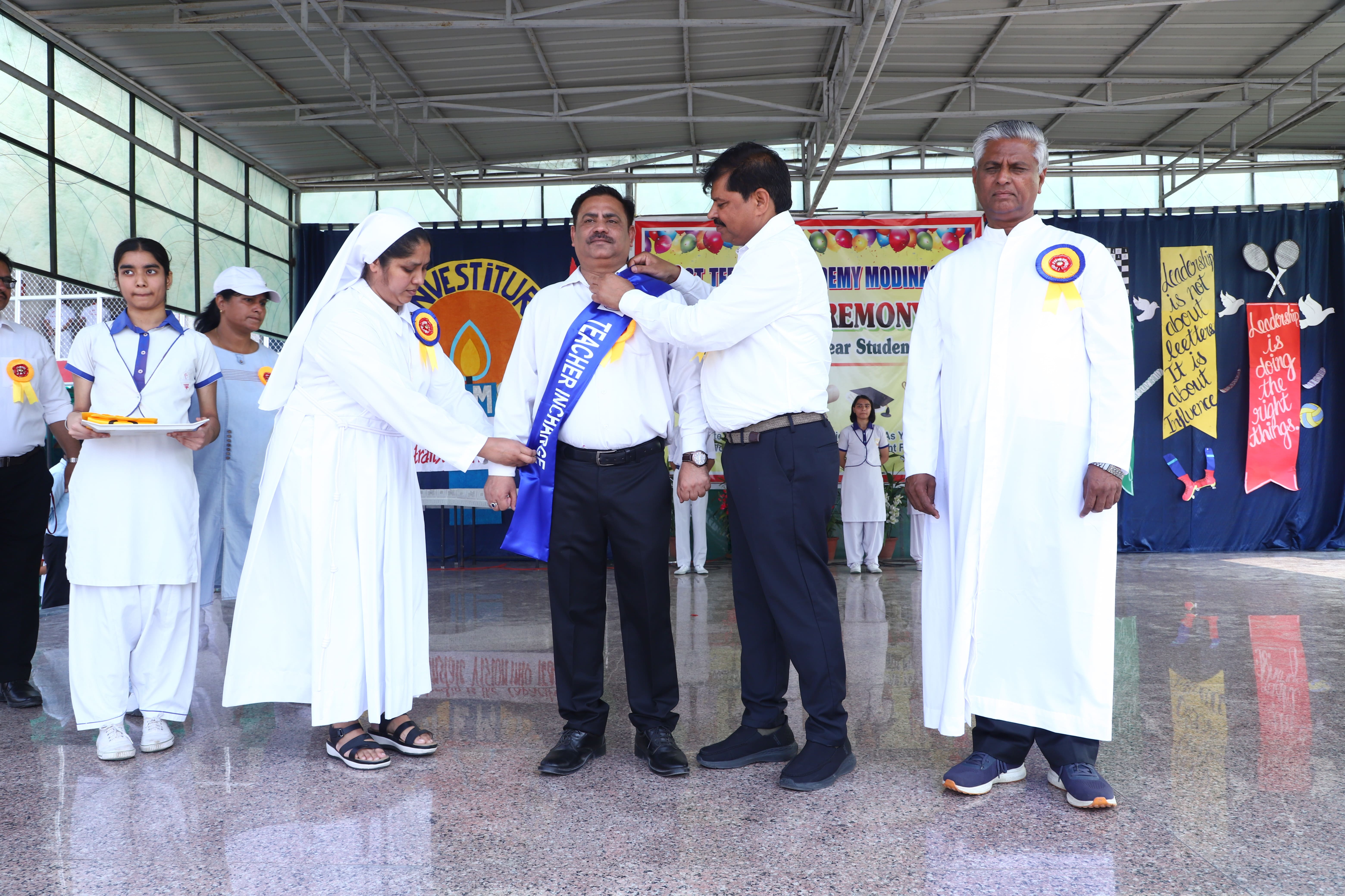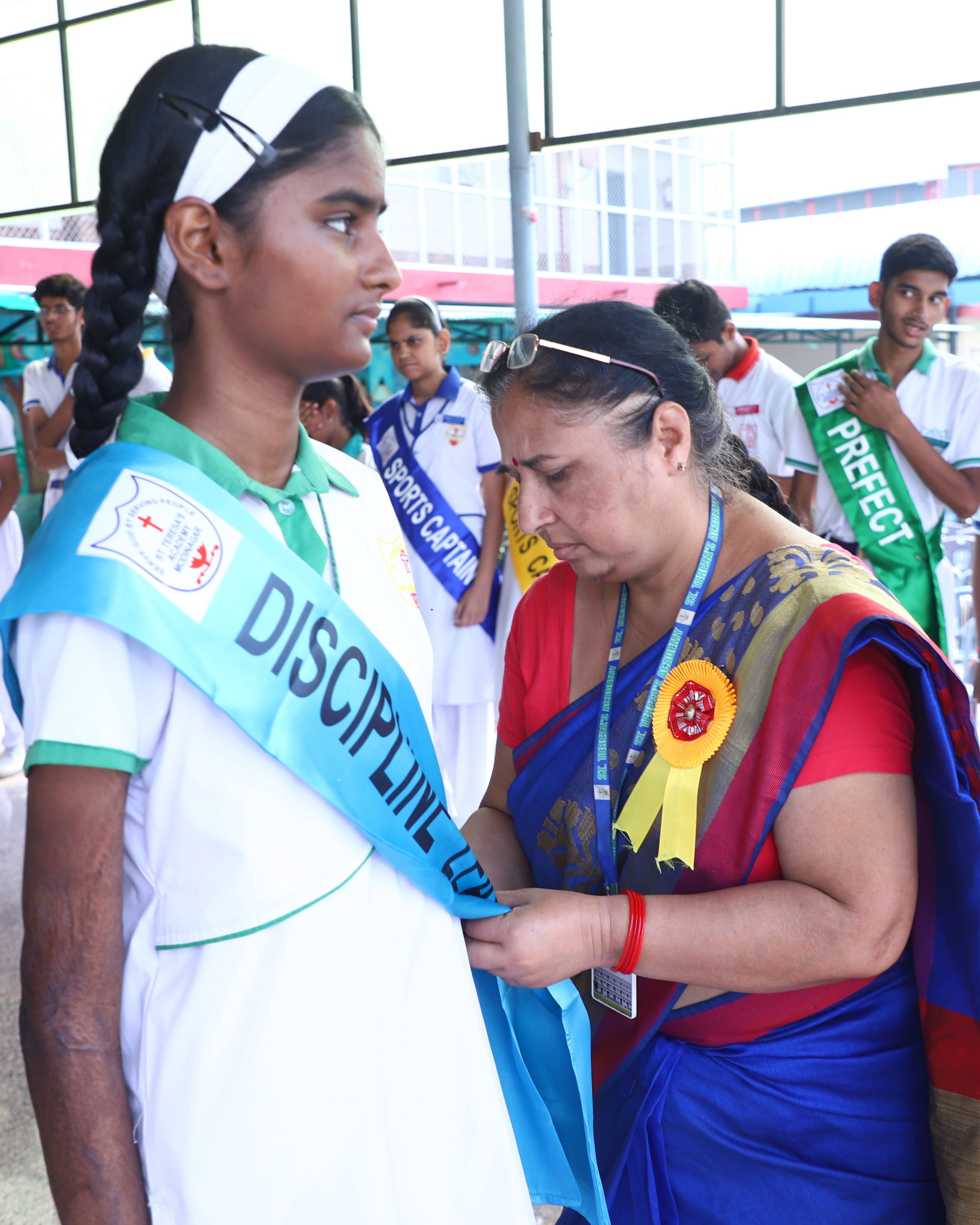 The Investiture Ceremony at St. Teresa's Academy, Modinagar is a prestigious event that marks the official induction of student leaders into their roles of responsibility and service. During the event, newly appointed leaders, including the Head Boy - Abhishek Sirohi, Head Girl - Divyanshi, Asst. Head Boy - Shaurya Dixit, Asst. Head Girl - Bhavya Nagpal, House Captains, and Prefects, receive their badges and sashes, signifying their readiness to lead with integrity and inspire their peers.