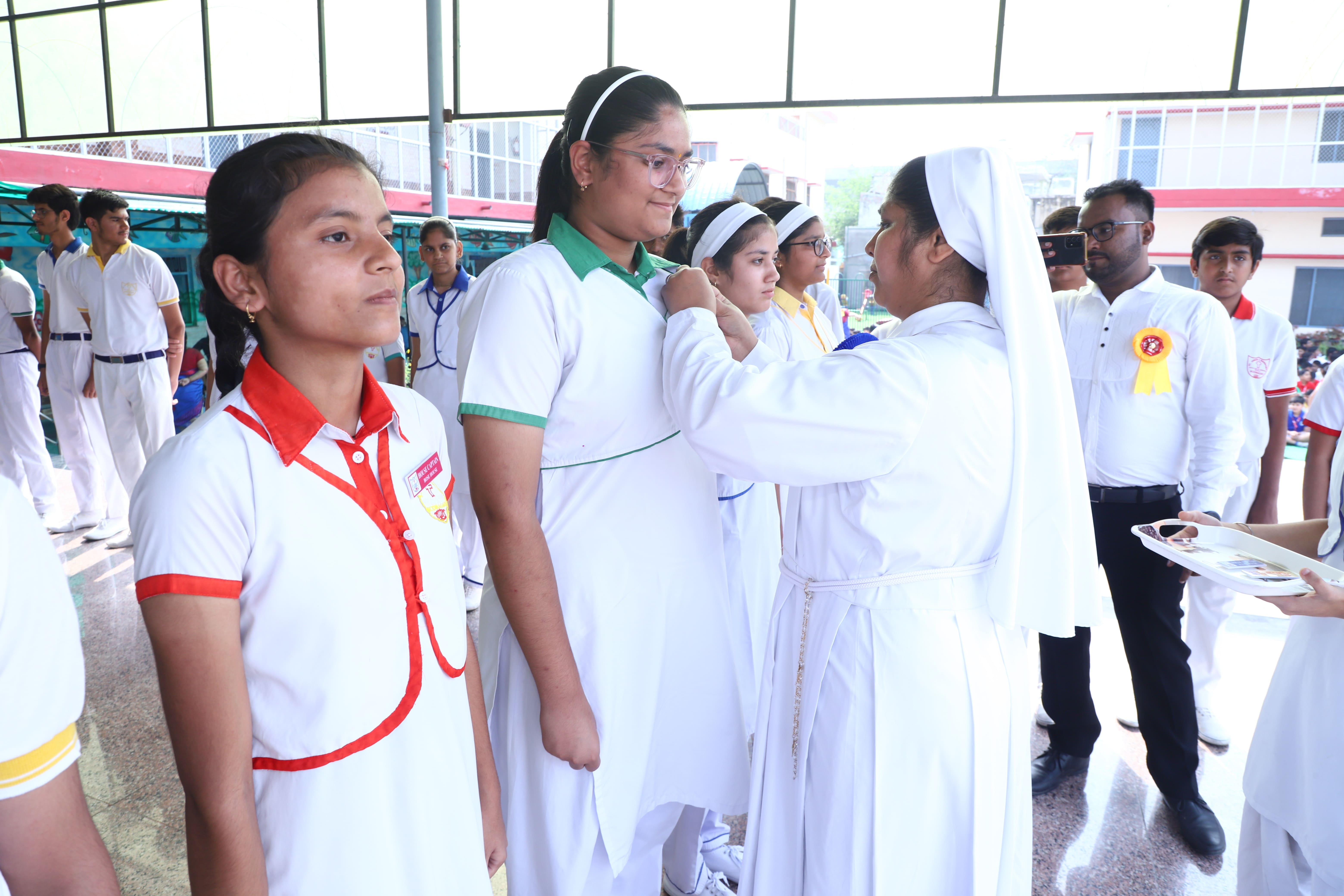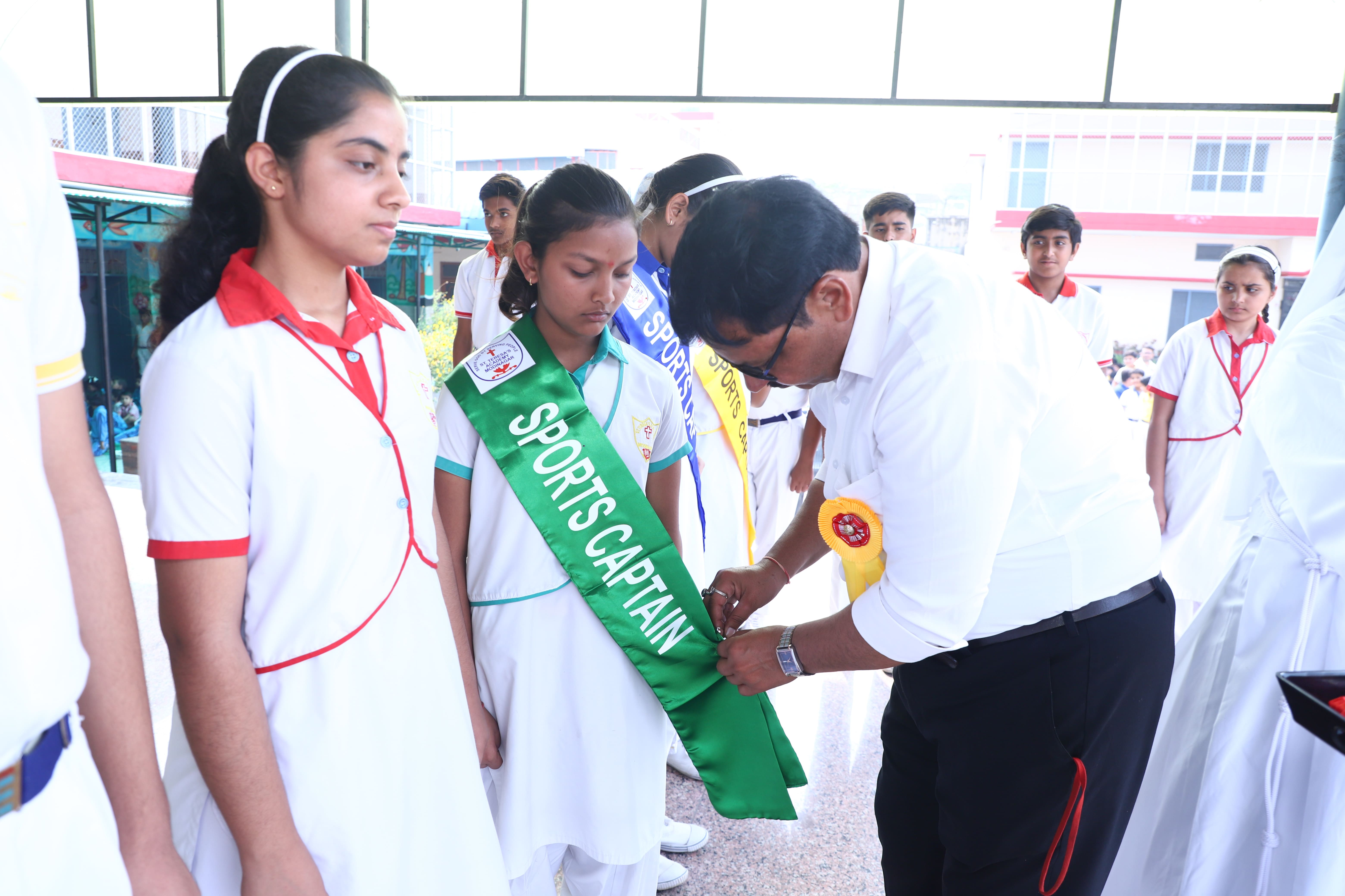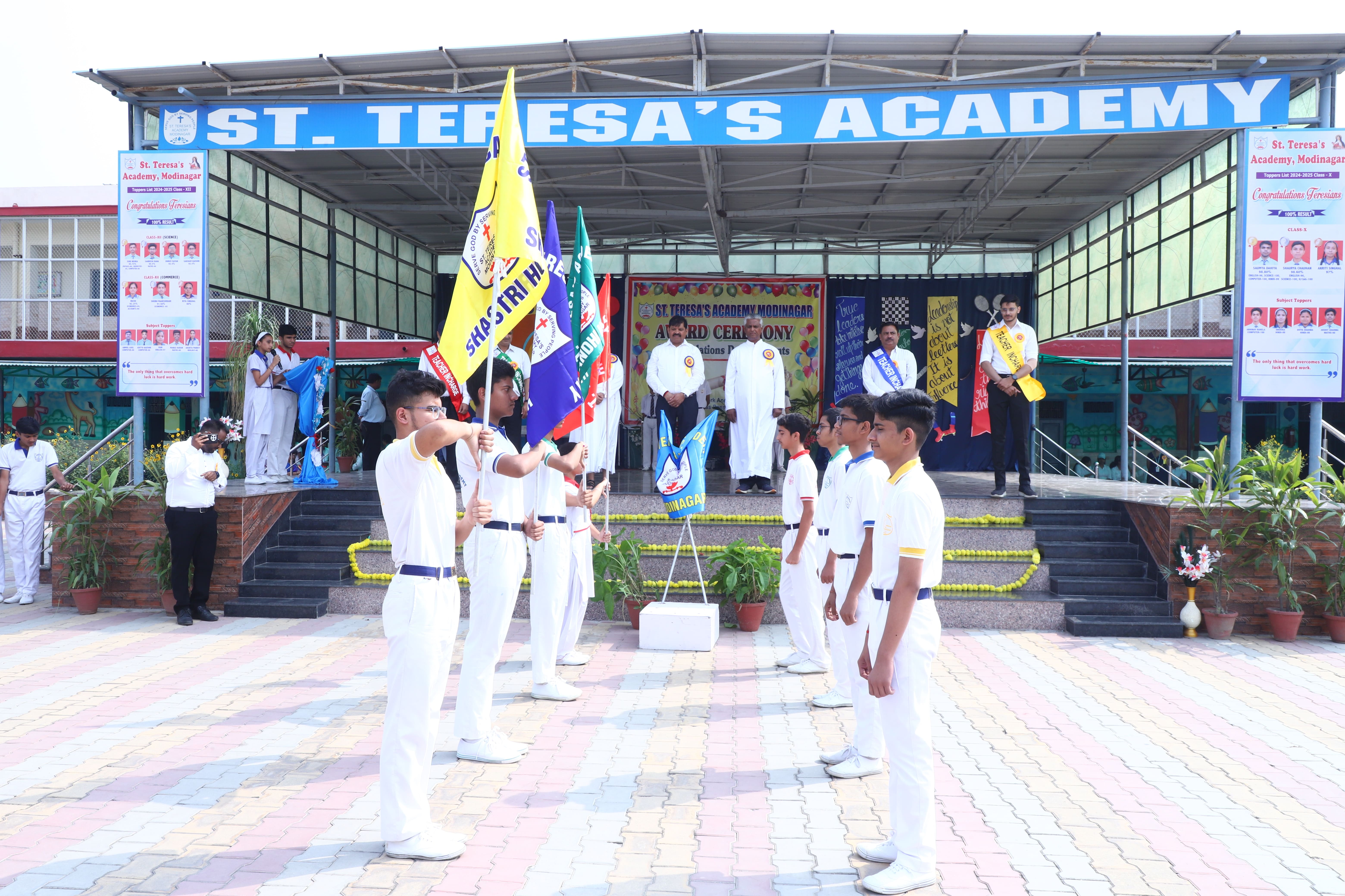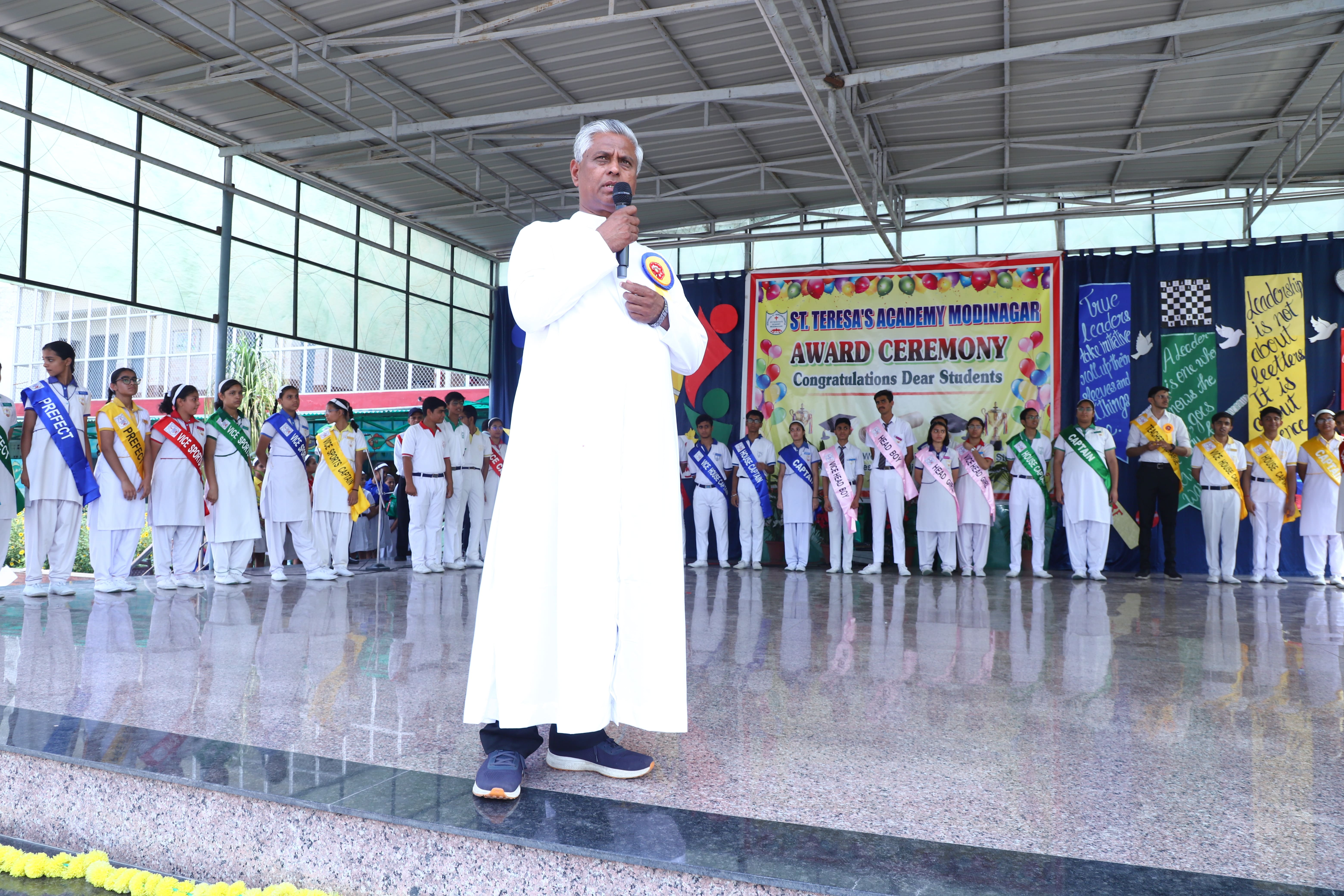 The Investiture Ceremony at St. Teresa's Academy, Modinagar is a prestigious event that marks the official induction of student leaders into their roles of responsibility and service. During the event, newly appointed leaders, including the Head Boy - Abhishek Sirohi, Head Girl - Divyanshi, Asst. Head Boy - Shaurya Dixit, Asst. Head Girl - Bhavya Nagpal, House Captains, and Prefects, receive their badges and sashes, signifying their readiness to lead with integrity and inspire their peers.